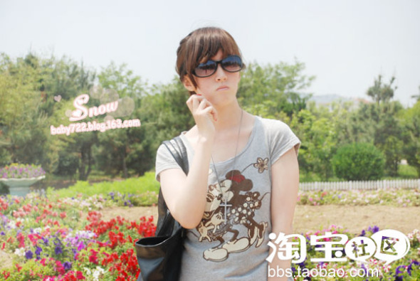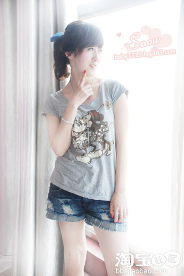 今年大热的米奇T恤+破边牛仔短裤,扎一个高高的马尾,清清爽爽的去HAPPY