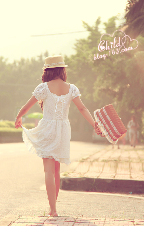 道具:花环+日系草帽+清爽连衣裙+白色花朵木屐鞋+复古手提蓝