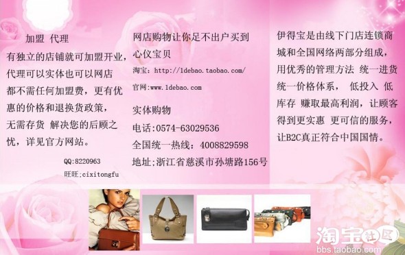伊得宝http://www.1debao.com/http://www.1debao.taobao.com海宁皮具火热招商中,诚寻网店代理和实体店代理,一件也代发。货源稳定价格实惠发展空间大。每日新款供选择。投资少见效快。欢迎您的光临。请联系客服qq8220963欢迎兼职宣传员的加入,具体详情请跟我联系。