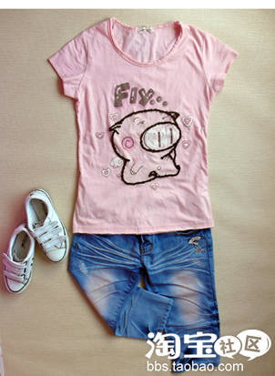 第六款,【小雨】超休闲周末搭,不管天气怎样,看着衣服上憨憨的小猪就心情大好,舒舒服服逛街去,如果有小雨相伴就太完美了,不会热热的啦!