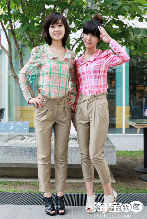搭配哈伦裤,这个裤子很有特点,高腰的,很显身材,LILI很喜欢哈,就是LULU的大一号,有点宽松的感觉,我的就比较紧了。。我比LULU胖。。555