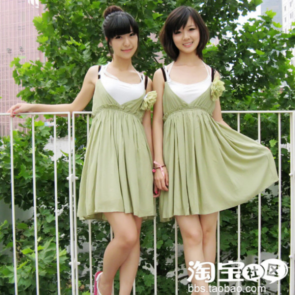 可爱的绿色吊带连衣裙,这个夏天看着非常的凉爽哦~配上送的胸花。太美丽了~手感非常好哦~