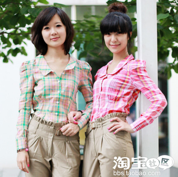 这个衬衫很好看,颜色很亮,而且还有流行的泡泡袖和珍珠扣
