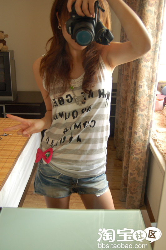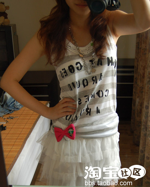 露肤度较高的背心,牛仔+蕾丝的甜辣组合相得益彰。背部的蕾丝花纹设计,使得可爱的T恤变得有点小性感,重叠的效果提升整体平衡感。