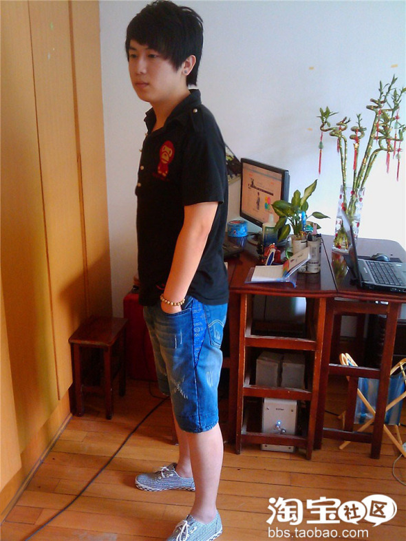加上金色红框LOGO,不错,庄重而时尚,在搭配牛仔蓝色短裤再加抓痕效果,