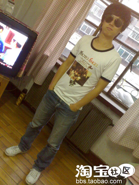 好吧,那我来装酷好了,黑边白色,照片图案短袖,