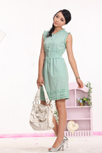 浅绿色镂空收腰连衣裙+手提包+银色高跟鞋