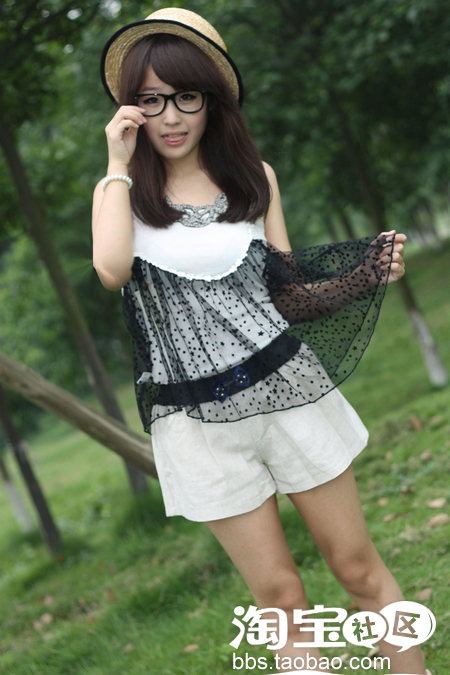 白色背心是紧身的,但是外面的黑色吊带非常宽松,把上身的部位显小了,黑纱又是若隐若现的感觉。