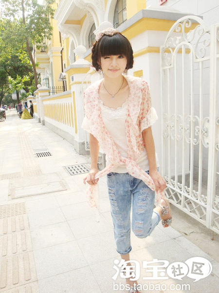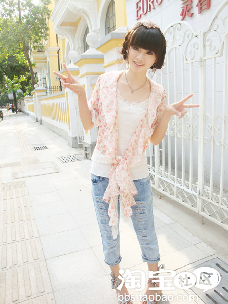 背心+小碎花外套+牛仔中裤,休闲又有点特别,雪纺薄碎花外套,夏日里也不会热哦,同时可以掩盖穿吊带裙子或者吊带衫的手臂肉肉呢。而且我总觉得这款外套挺仙的~~