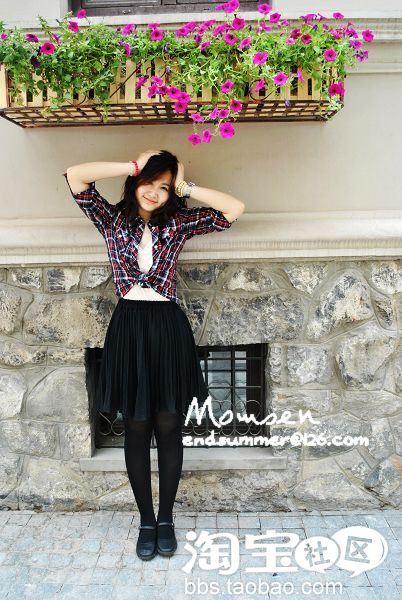 3.复古70'S 公主.复古格子衬衣+黑色高腰裙+黑色连裤袜子+黑色平底鞋。格子衬衣在腰部打结比较显瘦,高腰裙一直是复古的必备品。复古欧洲范儿,黑色也是必须。全身亮点就在衬衫上了。