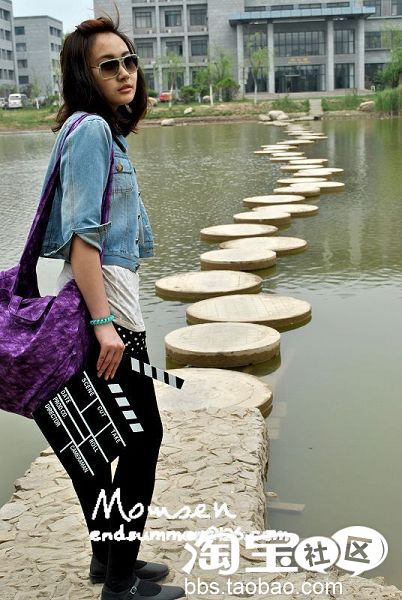 6.复古欧洲朋克(?)公主。大概复古的不那么朋克。所以只能说是血统不正的颠覆。哈。墨镜+牛仔上衣+黑色短裤+黑色连裤袜+黑色平底鞋+单肩紫色大包。黑色,几乎在我每组搭配里都有黑色。