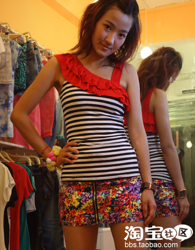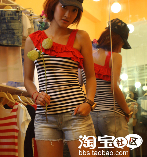 No.1 卷卷荷叶边的条纹T恤,又妩媚又青春,很有范儿呢