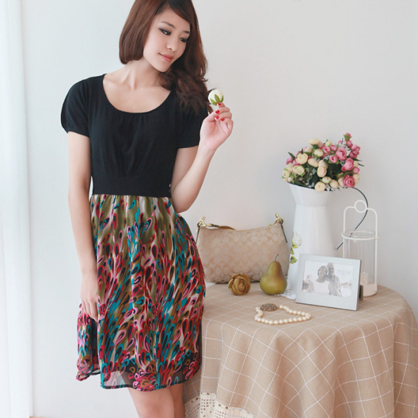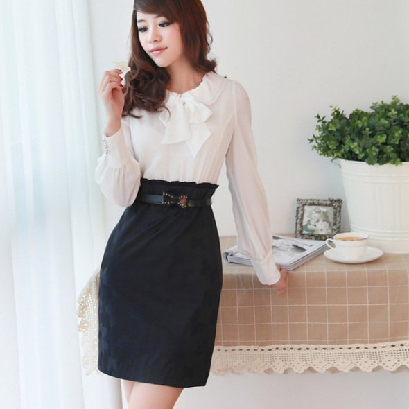 两色拼接随意在腰间绑一个蝴蝶结 休闲优雅的味道就出现了