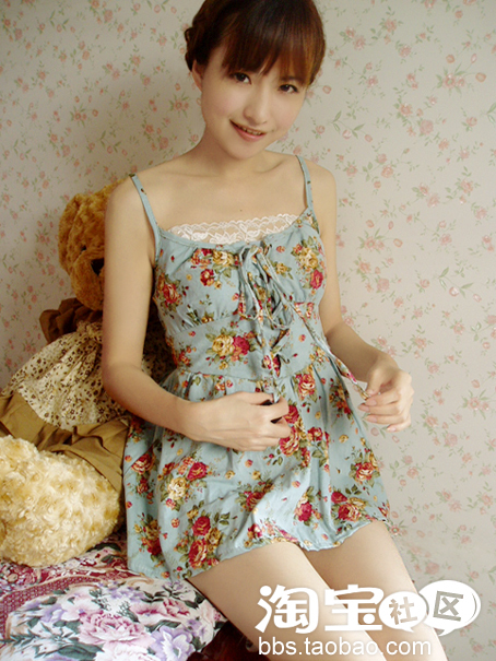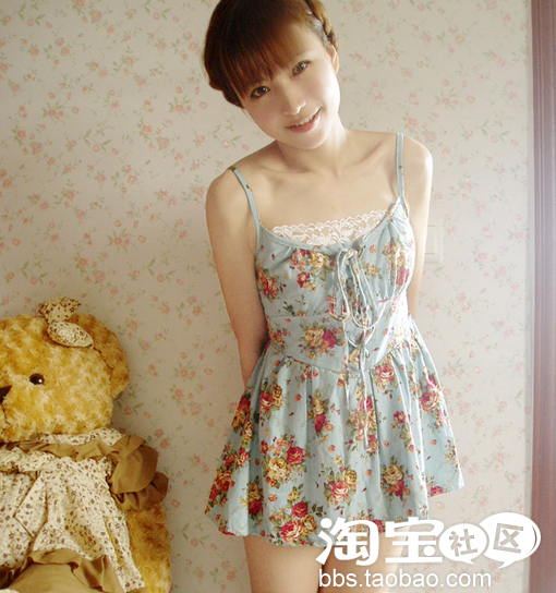 欧式的宫廷造型,韩国味浓厚的蓝色碎花,清新可人的超短造型令穿着者的身形更显高佻窈窕