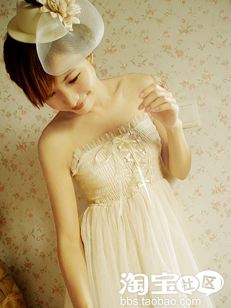 米色宫廷交叉绳婚纱裙,没有卖弄风情、太强烈个性的夸张调性,却能营造女性最优雅的一面,给人留下完美的好印象。在原有的奢华中,增添几许年轻的摩登气息,戴上一顶同色系的镶水钻迷你小礼帽,令衣服的奢华延伸,低调的华贵气息让你永远自信满满