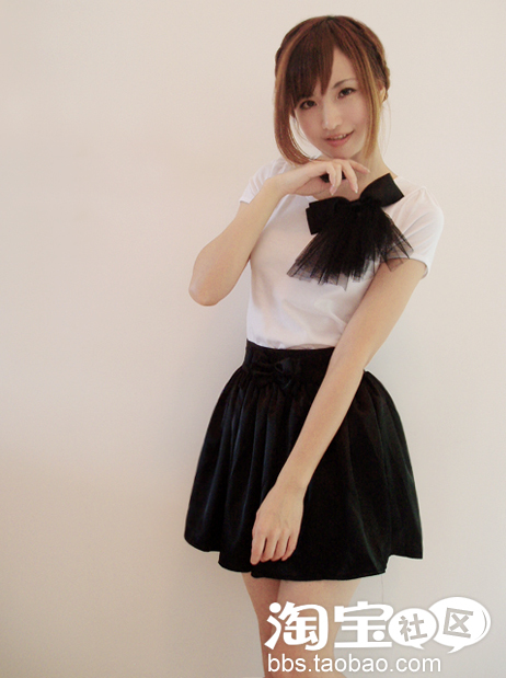 绸缎料黑色短裙一向以性感火辣所向披靡,搭配一件简约白T,扣上可爱的大蝴蝶结,顿时倾向小女生风格