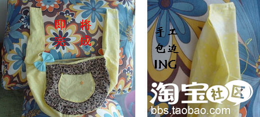 第三步:把包身缝完后基本就能看到雏形了,接着就肩带的缝合,这部分也可以自己DIY,任何样式都OK的。因为对踩缝纫机没信心,所以我宁可选择亲自手工包边,完成后连妈妈都夸我包的不错。嘻嘻~