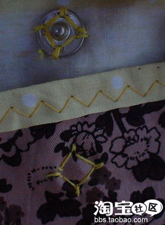 第四步:原本这样就OK的,但是妈妈建议我肩带部分除了打蝴蝶结还可以配2个纽扣上去,这样方便我以后再加带子变成斜挎包。于是,我又折腾起来!除了肩带装上2颗小木扣外,顺便给包包安个暗扣,为了不让外面的线看上去很奇怪,我还特地设计了缝合的针法,下面图上可以清楚看到哦!这样从外面看上去也相当自然。