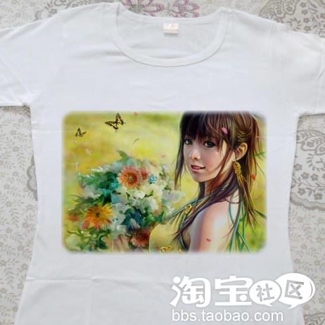 首先选择定制T恤就是先选择图案,烫画最大的优势就是可以实现照片级的效果,过度非常柔和,清晰,这是其他的印刷方式不能比的,而且可以一件起印,这让每位顾客都可以享受VIP级的待遇。比如下面这件T恤的效果,是其他印刷方式无法企及的。