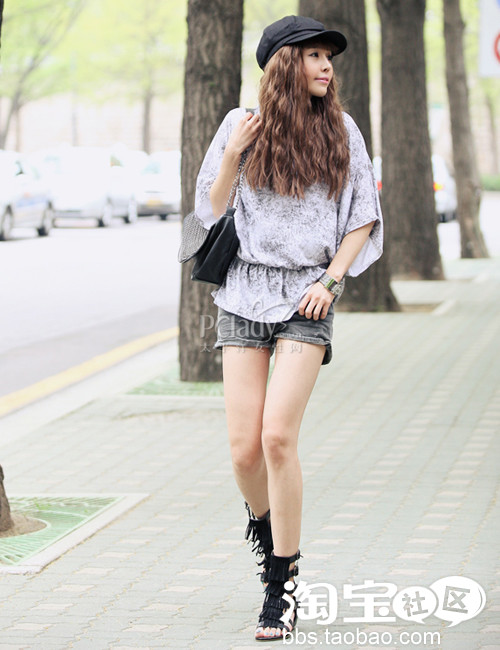 时尚点评:扎染款的蝙蝠袖上衣,宽松版型演绎街头风同时,还让你轻松显瘦,搭配黑色抓皱牛仔热裤和黑色罗马鞋,凸显摇滚风。