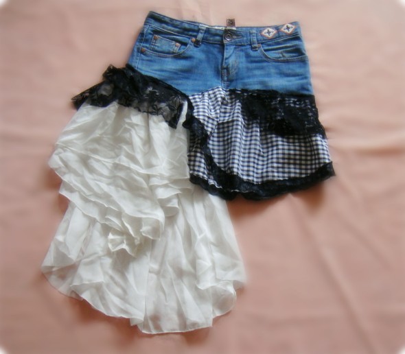 这俩天老公比较忙,一个人闲来没事,就拿出不穿的旧衣服来改改,呵呵,本来是我自己的一条七分裤,格子的那个是姐姐送的一件衬衫的袖子,黑色蕾丝呢,是之前店里卖剩的小披肩,雪纺也是店里卖剩的意见次品的YY。改好了,自己喜欢得不得了呢,穿上的效果要比平铺好很多呢,就是现在一个人没法拍,呵呵,哪天啊,穿上去好好多拍点照片,太佩服我自己了呢,哈哈