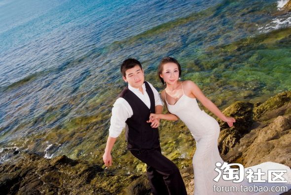 这是大东海水晶宫礁石,是拍摄的第一套衣服,太阳好大,照在海面上相当刺眼呢,我们一般都是闭着眼睛摆好pose,摄影师叫睁眼才能睁的,呵呵