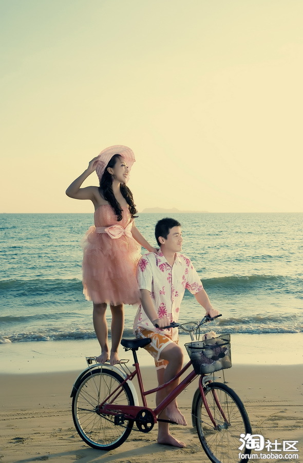 这是动感小短裙哦,拍摄的最后一套衣服(我这发片顺序有点乱,大家谅解)这是黄昏时候了,海边很美,很多工作室都在拍摄呢(估计三亚人民见怪不怪了,都是来旅游摄影的,呵呵)道具自行车还有一对可爱的小熊!