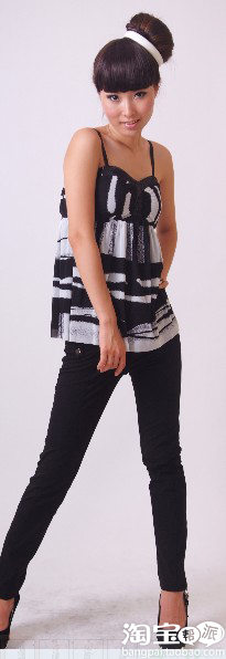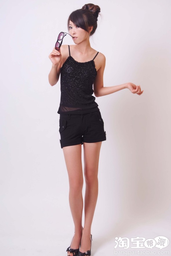 非常显瘦的黑色吊带小背心与短裤相配,性感!