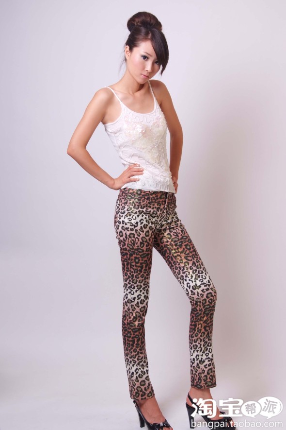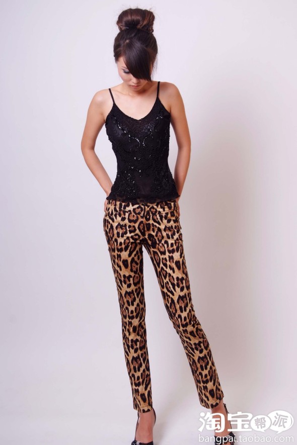 黑色上衣有压制豹子纹铅第裤的跳跃感。