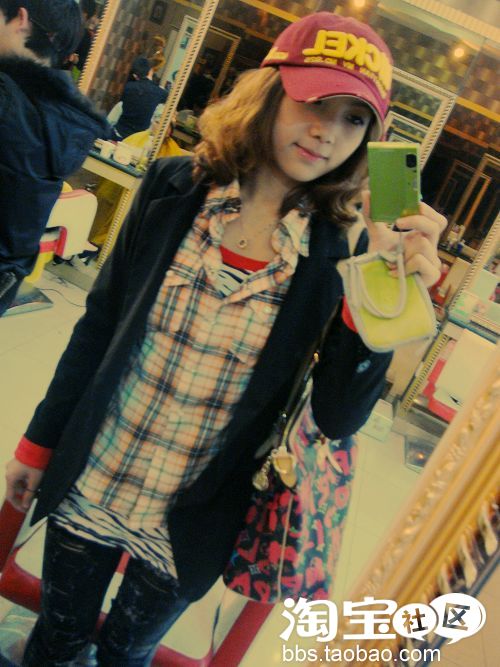 很爱格子衬衫和黑色西服的搭配,里面加了斑马纹红色袖子的长T,下面的大热的破洞雪花裤哦,我喜欢帽子,呵呵