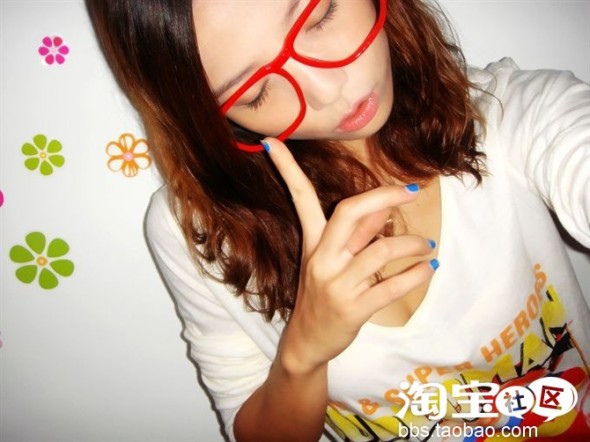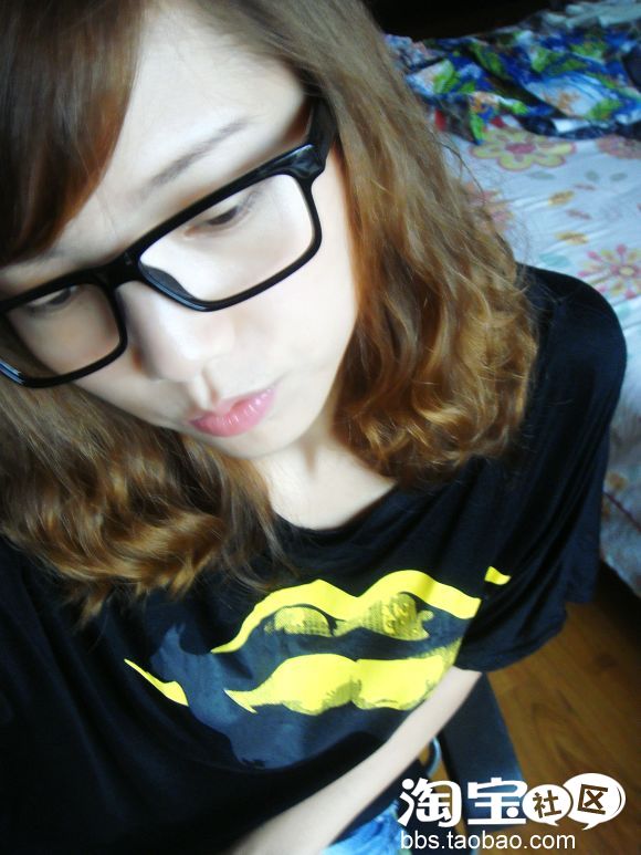 黑色大嘴唇T加蓝色牛仔短裤,很欧美哦,黑框眼镜让人看起来更潮哦