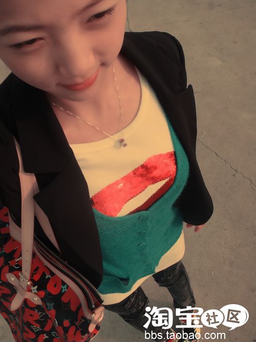亮片红唇长T,蓝色针织开衫,黑色小西服,破洞雪花裤,再加我爱的鞋子,哈哈。。。我超喜欢的风格