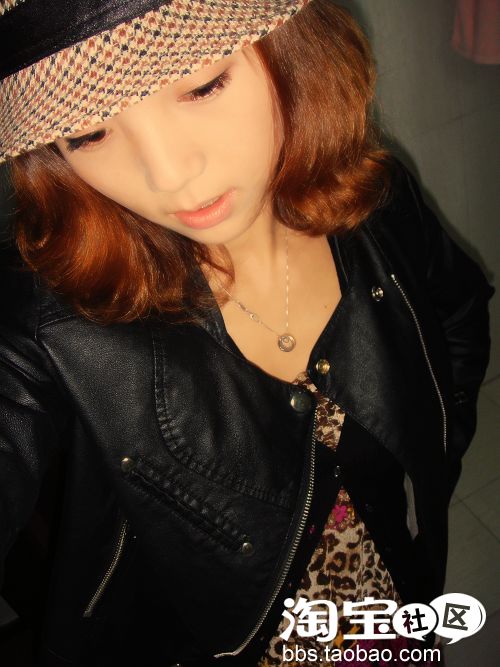 黑色小羊皮皮衣,豹纹雪纺裙,格子小礼帽,有点欧美,但又有点浪漫的感觉哦,呵呵