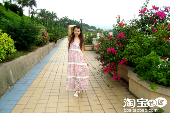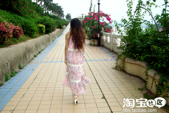 粉色的波西米亚长裙 + 白色花朵高跟鞋