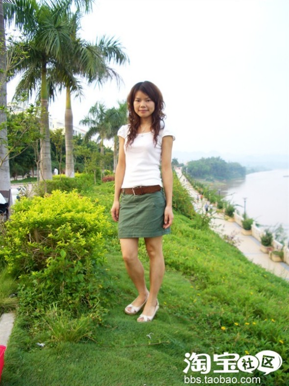 白色带来清爽感觉,与军绿色的A字短裙搭配,看起来简单又大方,给人一种很休闲的感觉。