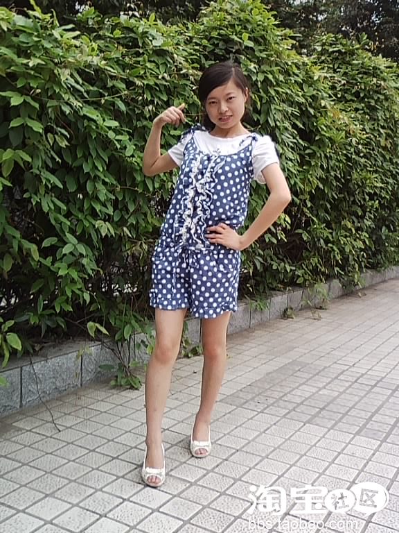 白色泡泡袖T恤+蓝色波点吊带连体裤,打造俏丽怡人公主