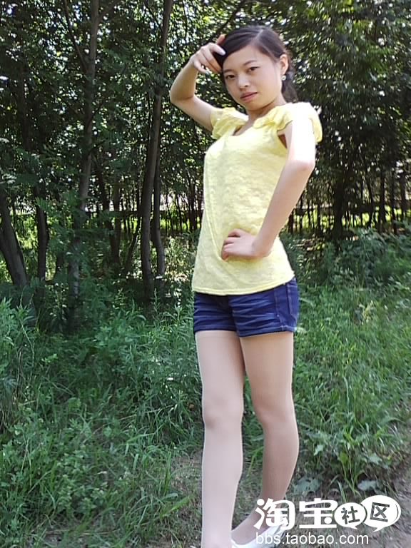 浅黄色蕾丝肩章飞袖短T+深蓝色修身短裤+亮晶晶冰丝长袜,打造随意个性公主