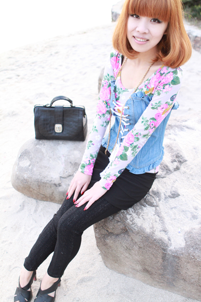 今年很火内衣外穿,这个是两件套,里面的是碎花T恤,外面的是牛仔的,很完美的组合
