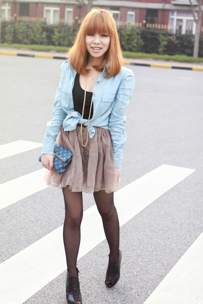 牛仔蓝的垫肩衬衫加藕色的蓬蓬裙,好像市面上黑色蓬蓬裙比较多,但是这个藕色的超美