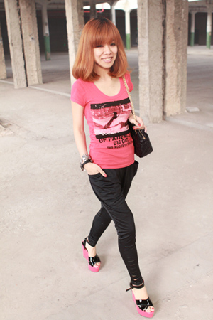 哈伦裤来着,估计人手一条了,这个比较特别,裤腿下面有破洞的