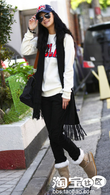 第六款:深蓝色米字旗棒球帽+黑色围巾+白色卫衣+黑色紧身裤+卡其色毛边鞋