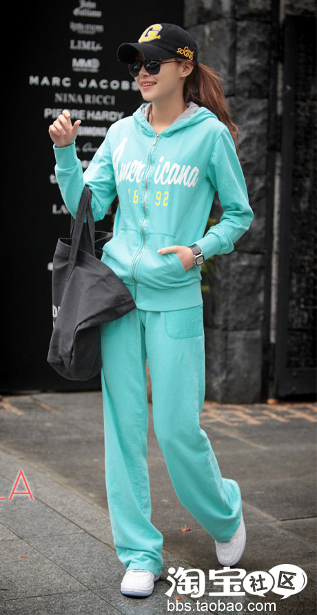 第四款:黑色棒球帽+浅绿色休闲套装+白色平底鞋