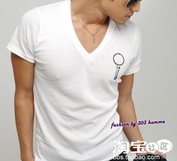 当v型的领子越来越out时尚圈的时候,你完全可以用一件深v的T恤来让自己缅怀一下这个曾 经风靡的时尚潮流。同时,深v型的领子逆势走红,更是当下的时尚青年们不能没有的一款选择!它不仅能更好的展示你的阳刚气概,更重要的会展现和圆领T恤截 然不同的休闲自然的最新潮流观念。你需要注意的是,深v的深度,是需要拿捏好的,而如何搭配也是非常重要的一点。毕竟,你总不想被别人说成是下流,或者暴 露狂吧?