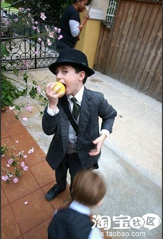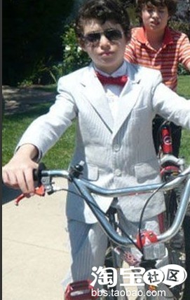 纨绔公子的白色西装衬上红色领结相当抢眼,立即让身后的男孩儿显得黯然无光。脸上架着哈雷镜与50年代的经典偏分发型,让我们以为他胯下的不是一辆儿童单车而是一辆重型机车呢!