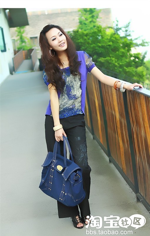 宝蓝色针织配上民族风格长裤,提着蓝色包包与上衣对搭,全身色彩非常合适,加上迷人笑容,显尽优雅!