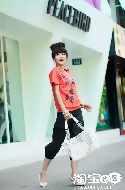 白色不规则印花,折叠领口呼应黑色手提袋,魅力无敌~