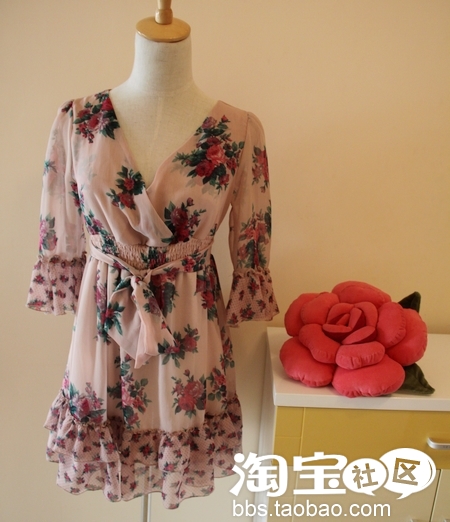 2.超淑女! 粉色大花 腰间系带 雪纺连衣裙