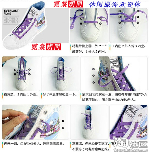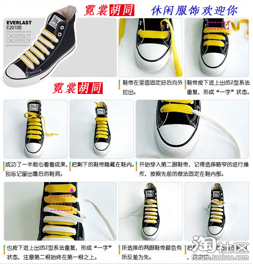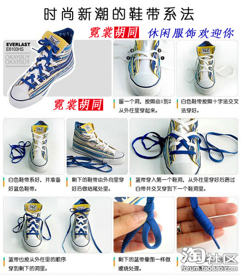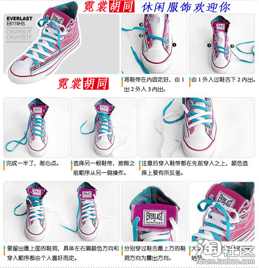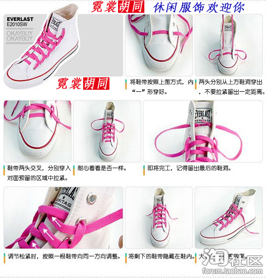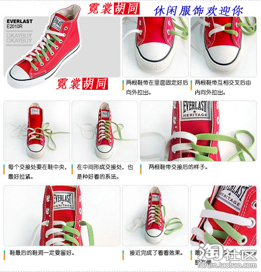 很多的 MM 和 GG 都喜欢穿匡威的帆布鞋吧你们一定很喜欢别人多种多样鞋带的系法吧 我这里有几种系法 不知道你会不会喜欢我是淘宝菜鸟 不擅言语 这样吧 给你示意图希望大家多支持哦 ................. ..........!有没有自己喜欢的呢...我搬来金字塔顶起再顶
