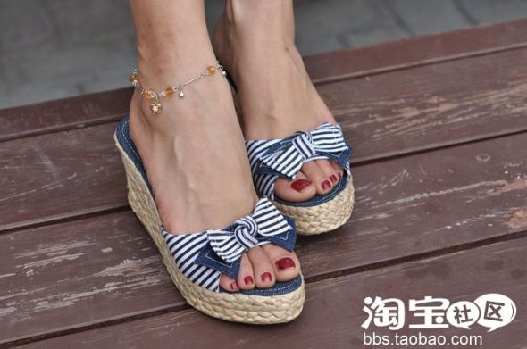 两款超级漂亮的条纹牛仔和蝴蝶结田园风格的坡跟拖儿~