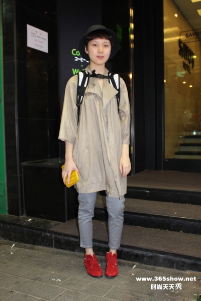有才:卡其色伞形风衣配上宽沿帽背一个双肩包,有点小小探险家的味道。9分仔裤配上扎眼的红色平底短靴,减龄功效真是100%!是不是没想到,军旅风也是可以这么可爱的呢?